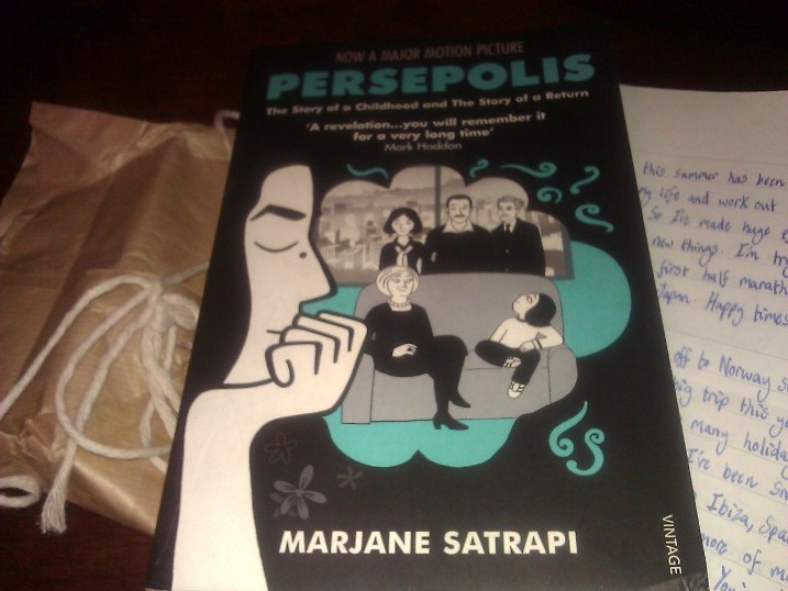 And, oh, did it inspire happiness! I’ve been bouncing around the house all evening, eager to read my new book,  Persepolis by Marjane Satrapi, which is a story about daily life in Iran.