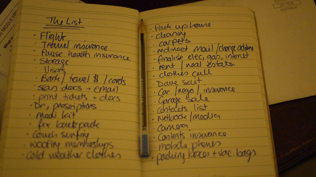 The most confronting part of packing up my life is deciding where to start… and then staying focused. Being a someone who responds well to visuals, I have found myself breaking down this daunting task with lots of about-the-house cues. At the moment my world is filled with stacks of boxes, piles of clothes, lists (yes, more than one), mind maps, geographical maps, spread sheets, research documents, travel books and lots of bags waiting to serve their purpose in life.
