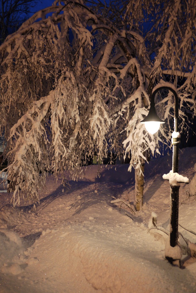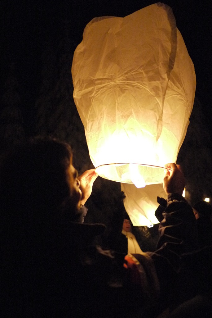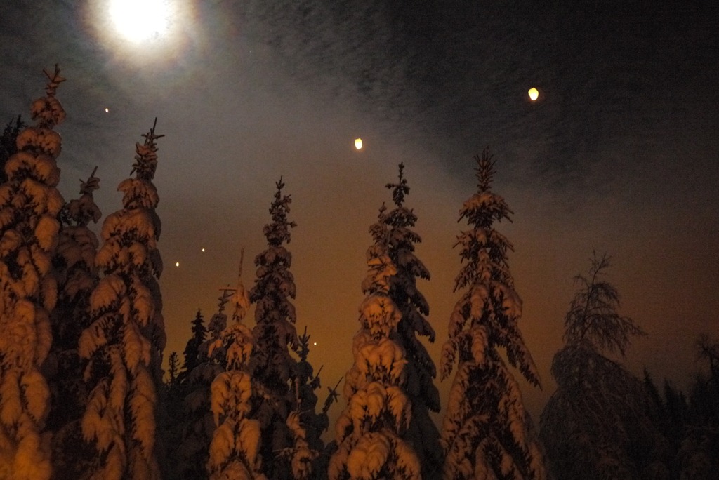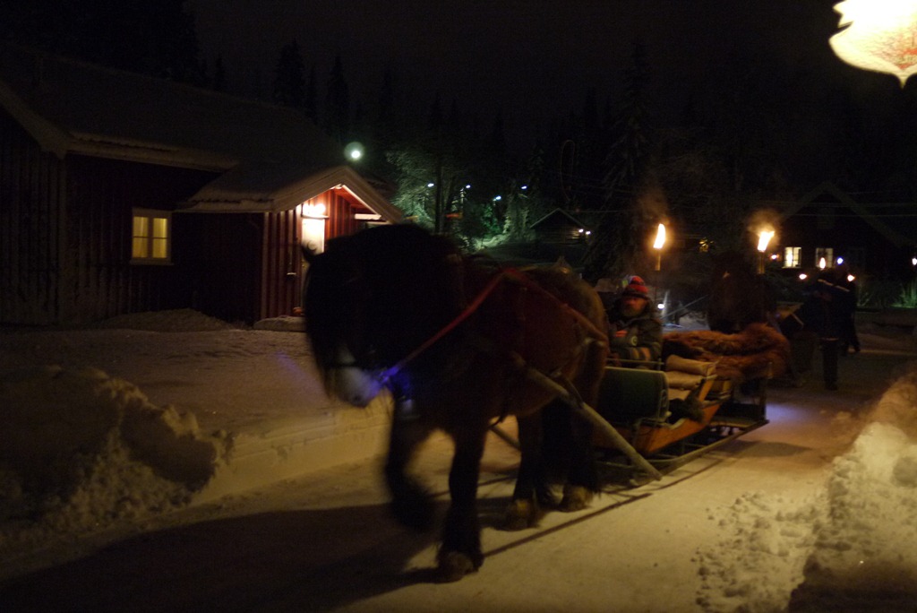 Half way into the sleigh ride we stopped, deep in a pine forest and shivering from the –8°C conditions, to be served warm berry drinks, huddle around fires that seemed to magically appear in the snow, and send lanterns into the winter night.