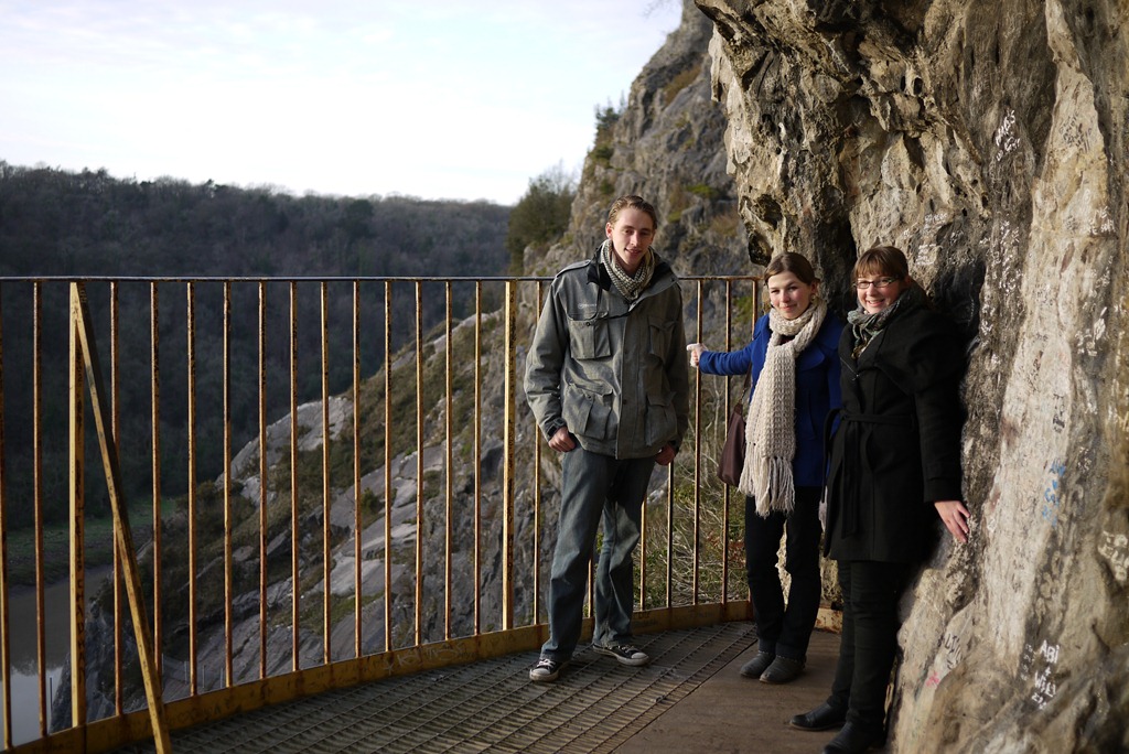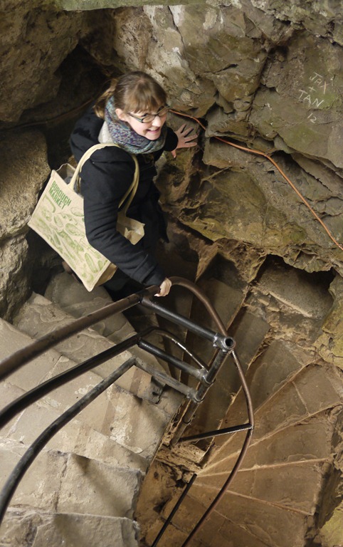 View of Bristol suspension bridge from the hilltop camera obscuraNic descending into the cave passage leading to the cliff-side chapel in Bristol UK