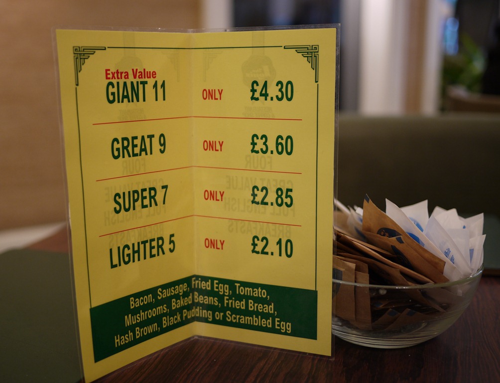 • A good value Welsh breakfastSitting amongst gossiping old women in a busy cafeteria trying to decide whether to order the Giant 11 or Great 9 breakfast for a maximum charge of £4.30. (In the end we chose the Great 9 so we could opt out of the black pudding.)
