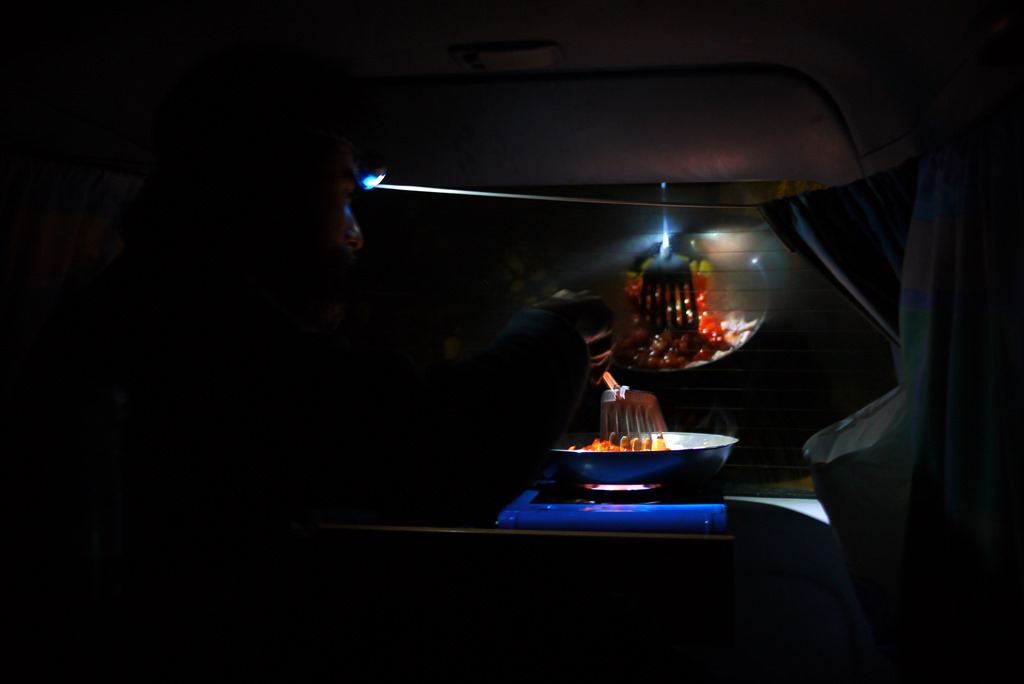 Laughing with my fella as we learn to cook in a campervan in winter in the United Kingdom.