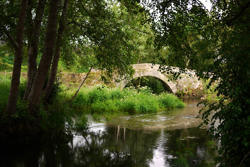 Happy flowers follow the trail -  Walking Camino de Santiago from Sarria, Spain Villgae window - Walking Camino de Santiago from Sarria, Spain Bridge at Ribadiso -  Walking Camino de Santiago from Sarria, Spain Rain clears for a rainbow - Walking Camino de Santiago from Sarria, Spain