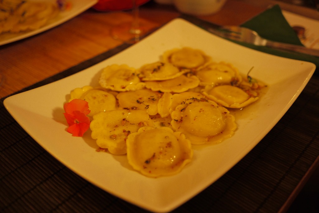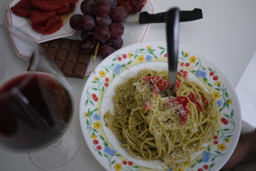 Feast on tostadas with cheese and tuna, juicy red grapes, sweet nectarines, handmade ravioli and lentil soup.