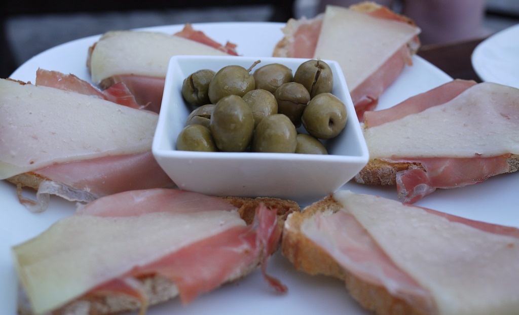 Think gespacho  and jamon serrano served on toast, salmon with capers, and olives from nearby groves.