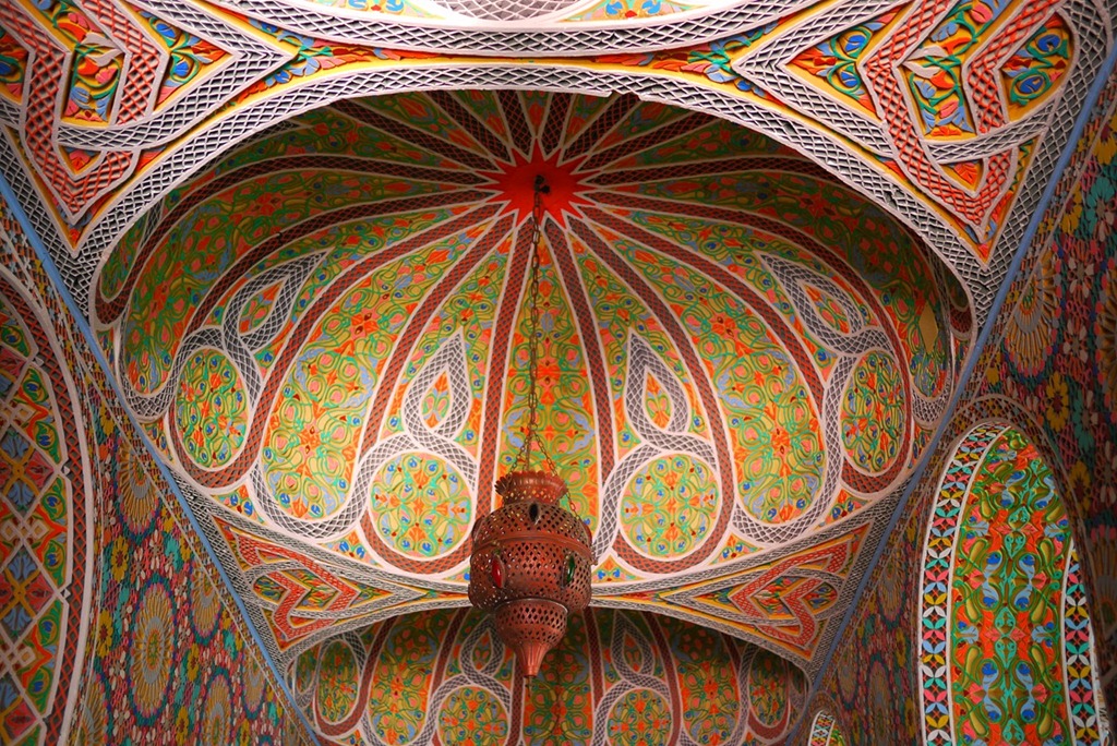 I’m sitting at a little round table, with red and green mosaic tiles, on an iron-lace chair with a red and white striped cushion. In my hand, a glittery gold tumbler holds fragrant mint tea that tastes as fresh as it looks. I feel a little regal, a little rich, with all this colour around me.