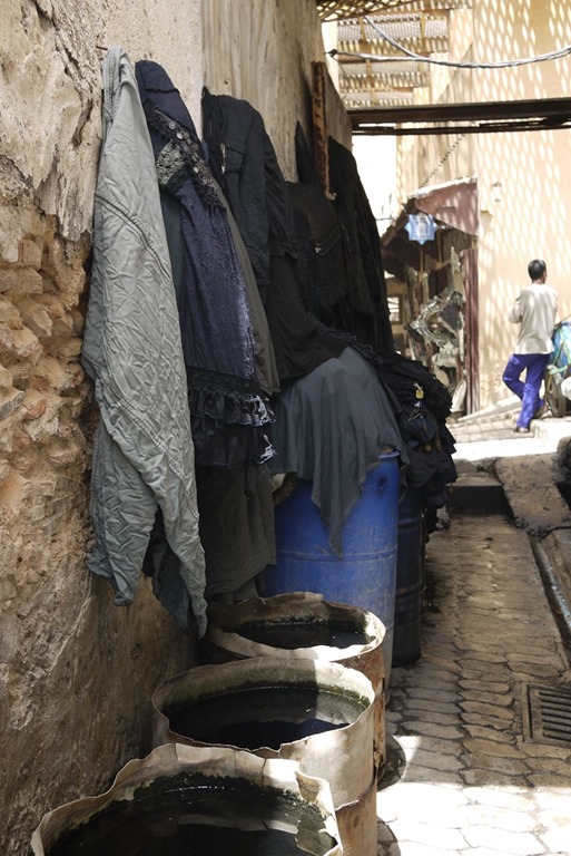Weaving deeper through stone archways and crumbling alleys brought me to the claustrophobic ting of hammers against copper and brass pots. Underfoot I found the blue-black stream trickling from the cloth-dying souq around the bend. As I ducked through a crowded tunnel, dodging the carts and barrows, I was faced by a hall of golden braid waiting to adorn the edges of kaftans, shoes, bags and cushions.