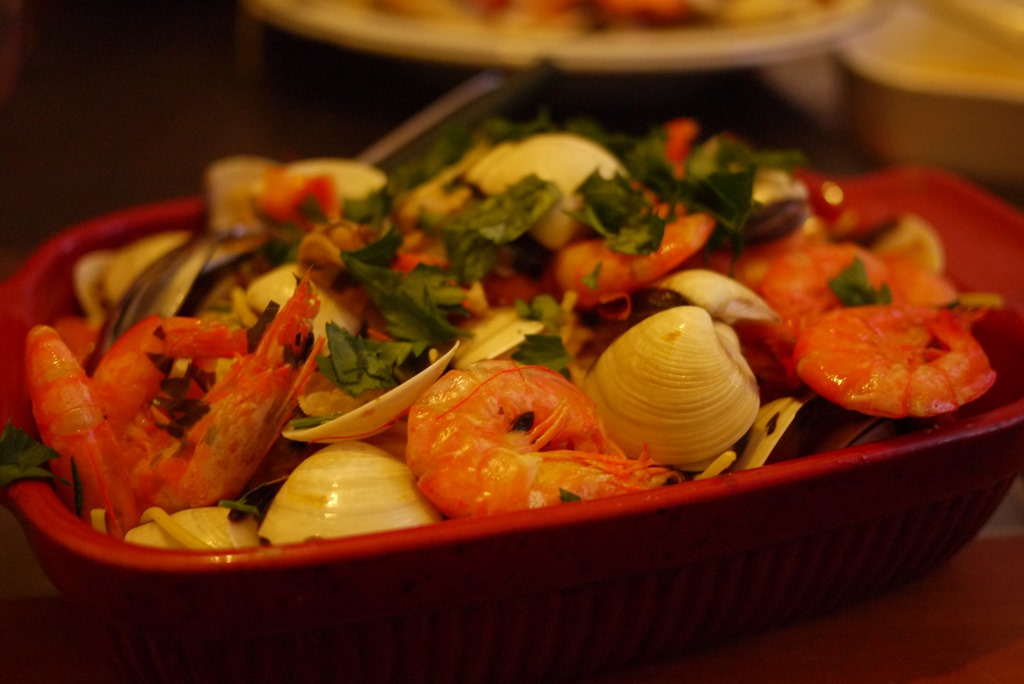 Shellfish and grilled tomatoes dressing gluten-free spaghetti.