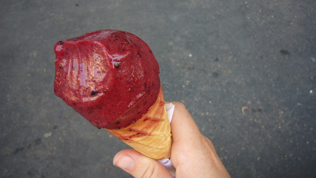 My first ever gluten-free ice-cream cone and first taste of my new favourite gelato flavour, fruiti de bosco.