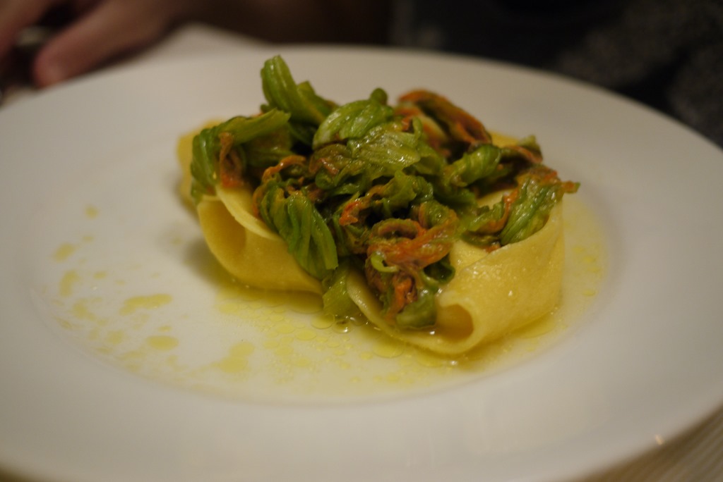 Two-cheese tortellini with sauteed zucchini flowers. Travel food photo Italy - BolognaTravel food photo Italy - Bologna