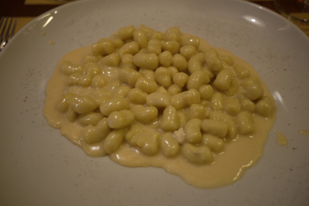 Gnocchi with five cheeses, grilled polenta and with salted cod.