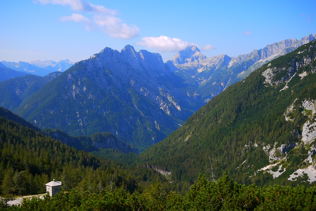 From the highest mountain pass in Slovenia, the world is a soothing spectrum of hinterland greens, precipice blues and alpine whites. Here, in the northern corner of Slovenia, beside the Italian and Austrian borders, silence drifts between the rugged pine slopes of Triglav National Park and the glimmering limestone peaks of the Julian Alps.
