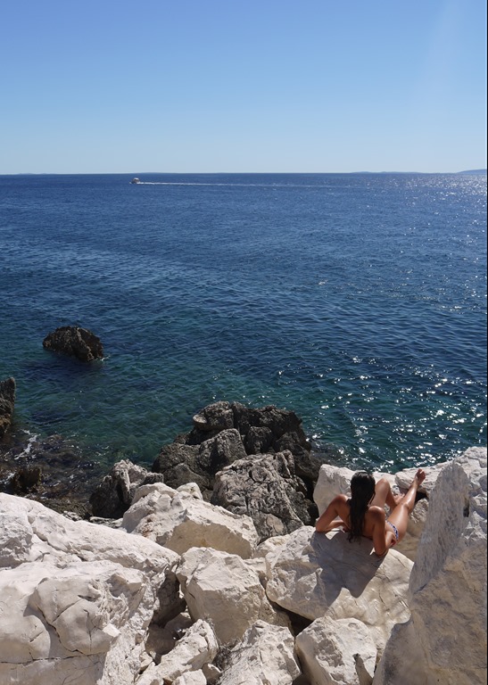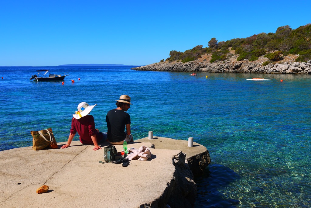 Driving north-east from Novalja, towards the tip of the skinny peninsular, our first random stop leaped beyond all expectations. Potočnica is a quiet series of bumpy little streets snaking along the rocky coast where terraced villas and resorts extend to private beaches. Without a map or clue of where to go, we followed the unsealed road down the hill to a dead-end parking lot and took one of the many little trails to the shore.
