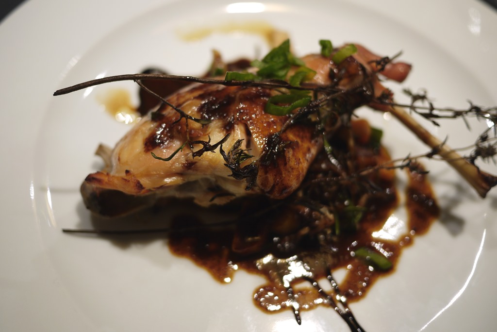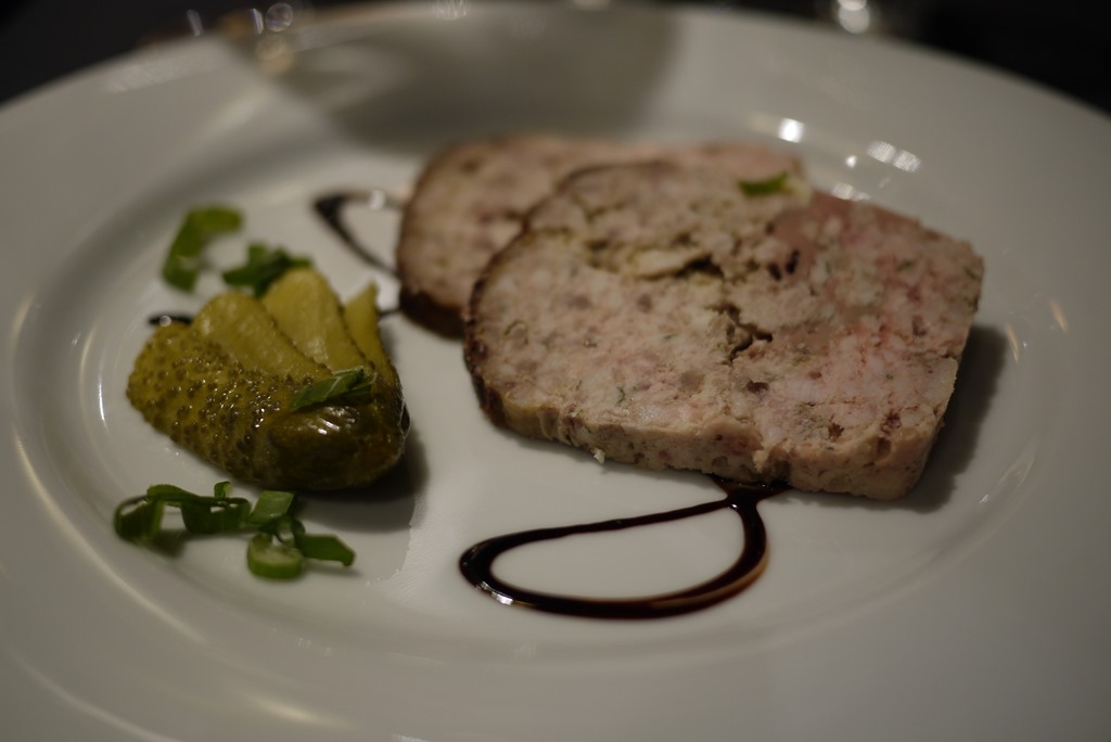 Terrine with pickled gherkins and balsamic, sweetbread (lamb thyroid glands) and balsamic rabbit at Michelin star, Bistro des Gastronomes (on Rue Cardinal Lemoine, just of St Germain, Paris).
