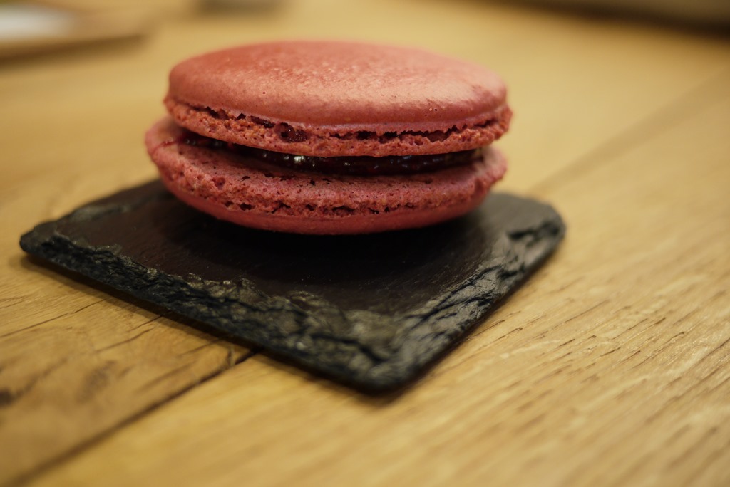 My first real French macaroon served on a square of slate with a rich espresso.